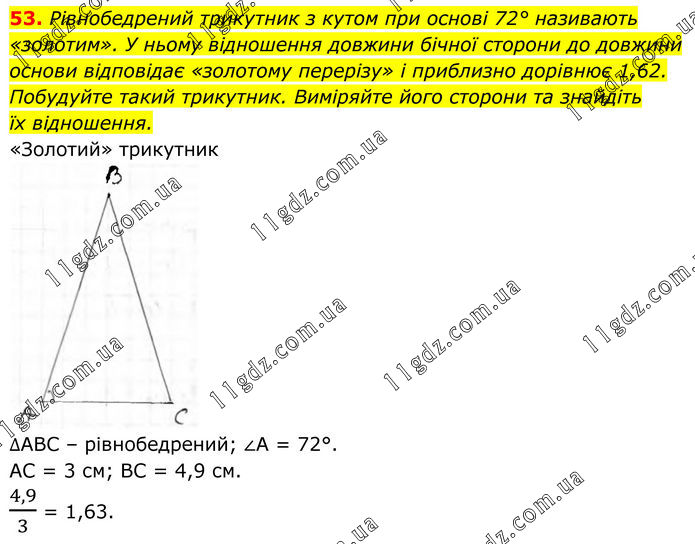 53. Рівнобедрений трикутник з кутом при основі 72° називають «золотим». У ньому відношення довжини бічної сторони до довжини основи відповідає «золотому перерізу» і приблизно дорівнює 1,62. Побудуйте такий трикутник. Виміряйте його сторони та знайдіть їх відношення. «Золотий» трикутник ∆АВС – рівнобедрений; ∠А = 72°. АС = 3 см; ВС = 4,9 см. 4,9/3 = 1,63.
