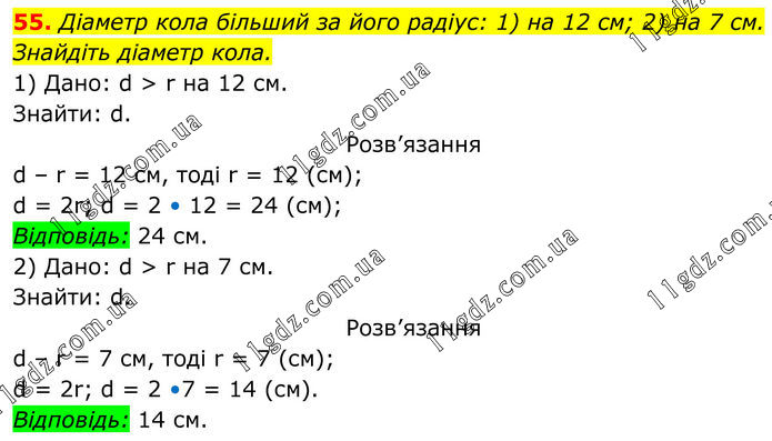 55. Діаметр кола більший за його радіус: 1) на 12 см; 2) на 7 см. Знайдіть діаметр кола. 1) Дано: d > r на 12 см. Знайти: d. Розв’язання d – r = 12 см, тоді r = 12 (см); d = 2r; d = 2 • 12 = 24 (см); Відповідь: 24 см. 2) Дано: d > r на 7 см. Знайти: d. Розв’язання d – r = 7 cм, тоді r = 7 (см); d = 2r; d = 2 •7 = 14 (см). Відповідь: 14 см.