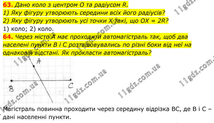 63. Дано коло з центром O та радіусом R. 1) Яку фігуру утворюють середини всіх його радіусів? 2) Яку фігуру утворюють усі точки X такі, що OX = 2R? 1) коло; 2) коло. 64. Через місто А має проходити автомагістраль так, щоб два населені пункти B i C розташовувались по різні боки від неї на однаковій відстані. Як прокласти автомагістраль? Магістраль повинна проходити через середину відрізка ВС, де В і С – дані населенні пункти.