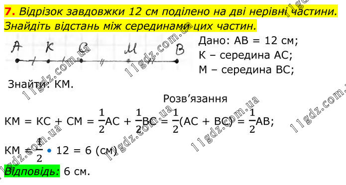 7. Відрізок завдовжки 12 см поділено на дві нерівні частини. Знайдіть відстань між серединами цих частин. Дано: АВ = 12 см; К – середина АС; М – середина ВС; Знайти: КМ. Розв’язання КМ = КС + СМ = 1/2АС + 1/2ВС = 1/2(АС + ВС) = 1/2АВ; КМ = 1/2 • 12 = 6 (см) Відповідь: 6 см.