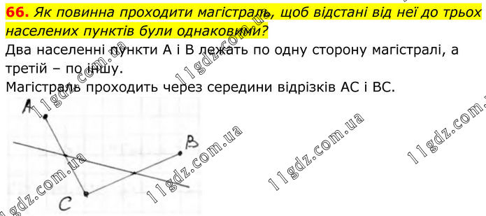 66. Як повинна проходити магістраль, щоб відстані від неї до трьох населених пунктів були однаковими? Два населенні пункти А і В лежать по одну сторону магістралі, а третій – по іншу. Магістраль проходить через середини відрізків АС і ВС.