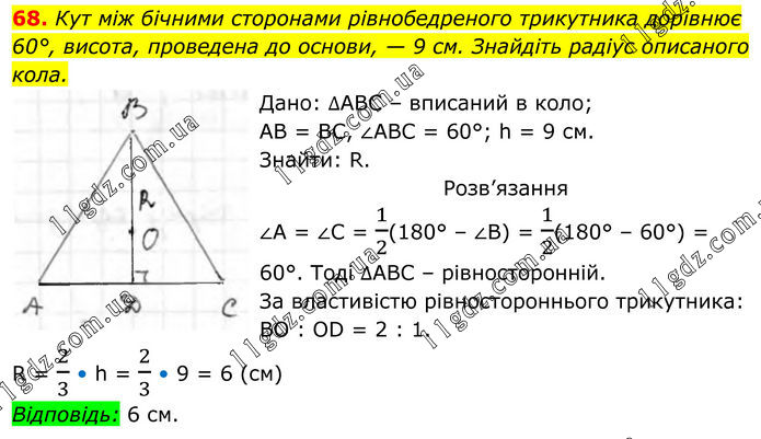 68. Кут між бічними сторонами рівнобедреного трикутника дорівнює 60°, висота, проведена до основи, — 9 см. Знайдіть радіус описаного кола. Дано: ∆АВС – вписаний в коло; АВ = ВС, ∠АВС = 60°; h = 9 см. Знайти: R. Розв’язання ∠А = ∠С = 1/2(180° – ∠В) = 1/2(180° – 60°) = 60°. Тоді ∆АВС – рівносторонній. За властивістю рівностороннього трикутника: BO : OD = 2 : 1. R = 2/3 • h = 2/3 • 9 = 6 (см) Відповідь: 6 см.