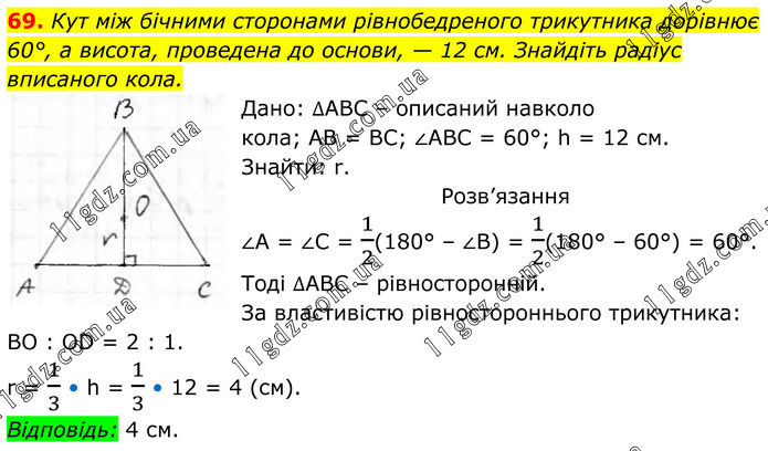 69. Кут між бічними сторонами рівнобедреного трикутника дорівнює 60°, а висота, проведена до основи, — 12 см. Знайдіть радіус вписаного кола. Дано: ∆АВС – описаний навколо кола; АВ = ВС; ∠АВС = 60°; h = 12 см. Знайти: r. Розв’язання ∠А = ∠С = 1/2(180° – ∠В) = 1/2(180° – 60°) = 60°. Тоді ∆АВС – рівносторонній. За властивістю рівностороннього трикутника: BO : OD = 2 : 1. r = 1/3 • h = 1/3 • 12 = 4 (см). Відповідь: 4 см.