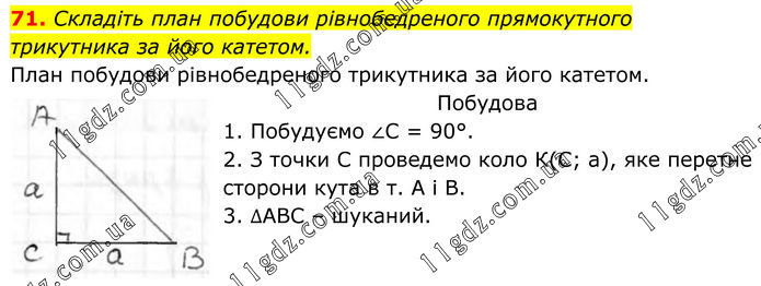 71. Складіть план побудови рівнобедреного прямокутного трикутника за його катетом. План побудови рівнобедреного трикутника за його катетом. Побудова 1. Побудуємо ∠С = 90°. 2. З точки С проведемо коло К(С; а), яке перетне сторони кута в т. А і В. 3. ∆АВС – шуканий.