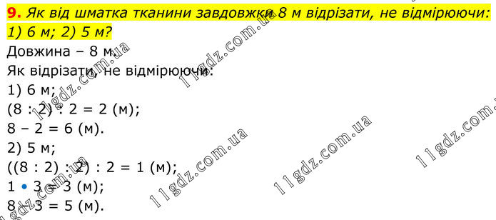 9. Як від шматка тканини завдовжки 8 м відрізати, не відмірюючи: 1) 6 м; 2) 5 м? Довжина – 8 м. Як відрізати, не відмірюючи: 1) 6 м; (8 : 2) : 2 = 2 (м); 8 – 2 = 6 (м). 2) 5 м; ((8 : 2) : 2) : 2 = 1 (м); 1 • 3 = 3 (м); 8 – 3 = 5 (м).