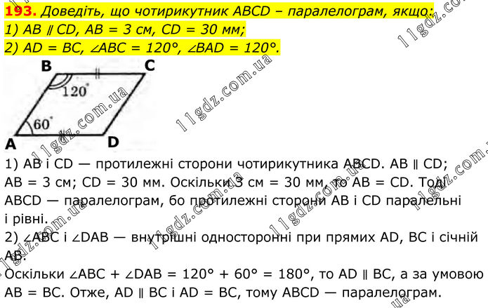 Доведіть, що чотирикутник ABCD – паралелограм, якщо: 1) AB ∥ CD, AB = 3 см, CD = 30 мм; 2) AD = BC, ∠ABC = 120°, ∠BAD = 120°. 1) АВ і CD — протилежні сторони чотирикутника ABCD. AB ∥ CD; АВ = 3 см; CD = 30 мм. Оскільки З см = 30 мм, то АВ = CD. Тоді ABCD — паралелограм, бо протилежні сторони АВ і CD паралельні і рівні. 2) ∠АВС і ∠DAB — внутрішні односторонні при прямих AD, ВС і січній АВ. Оскільки ∠ABC + ∠DAB = 120° + 60° = 180°, то AD ∥ ВС, а за умовою АВ = ВС. Отже, AD ∥ ВС і AD = ВС, тому ABCD — паралелограм.