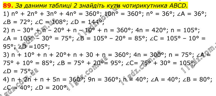 89. За даними таблиці 2 знайдіть кути чотирикутника ABCD. 1) n° + 2n° + 3n° + 4n° = 360°; 10n° = 360°; n° = 36°; ∠A = 36°; ∠B = 72°; ∠C = 108°; ∠D = 144°; 2) n – 30° + n – 20° + n – 10° + n = 360°; 4n = 420°; n = 105°; ∠A = 105° – 30° = 75°; ∠B = 105° – 20° = 85°; ∠C = 105° – 10° = 95°; ∠D =105°; 3) n + 10° + n + 20°+ n + 30 + n = 360°; 4n = 300°; n = 75°; ∠A = 75° + 10° = 85°; ∠B = 75° + 20°= 95°; ∠C= 75° + 30° = 105°; ∠D = 75°; 4) n + 2n + n + 5n = 360°; 9n = 360°; n = 40°; ∠A = 40°; ∠B = 80°; ∠С = 40°; ∠D = 200°.