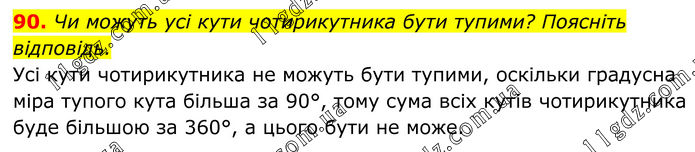 90. Чи можуть усі кути чотирикутника бути тупими? Поясніть відповідь. Усі кути чотирикутника не можуть бути тупими, оскільки градусна міра тупого кута більша за 90°, тому сума всіх кутів чотирикутника буде більшою за 360°, а цього бути не може.