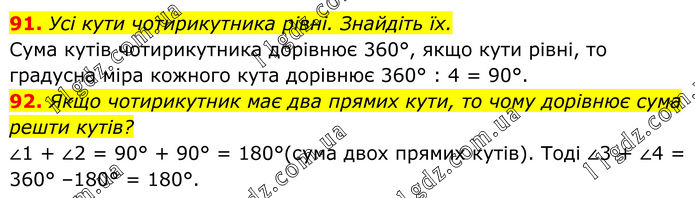 91. Усі кути чотирикутника рівні. Знайдіть їх. Сума кутів чотирикутника дорівнює 360°, якщо кути рівні, то градусна міра кожного кута дорівнює 360° : 4 = 90°. 92. Якщо чотирикутник має два прямих кути, то чому дорівнює сума решти кутів? ∠1 + ∠2 = 90° + 90° = 180°(сума двох прямих кутів). Тоді ∠3 + ∠4 = 360° – 180° = 180°.