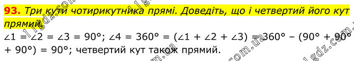 93. Три кути чотирикутника прямі. Доведіть, що і четвертий його кут прямий. ∠1 = ∠2 = ∠3 = 90°; ∠4 = 360° = (∠1 + ∠2 + ∠3) = 360° – (90° + 90° + 90°) = 90°; четвертий кут також прямий.