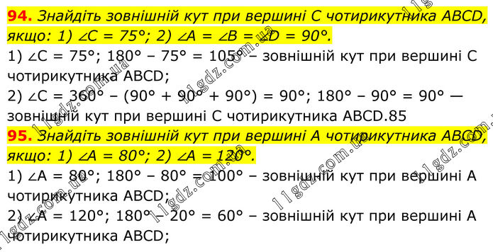 94. Знайдіть зовнішній кут при вершині C чотирикутника ABCD, якщо: 1) ∠C = 75°; 2) ∠A = ∠B = ∠D = 90°. 1) ∠C = 75°; 180° – 75° = 105° – зовнішній кут при вершині C чотирикутника ABCD; 2) ∠C = 360° – (90° + 90° + 90°) = 90°; 180° – 90° = 90° — зовнішній кут при вершині C чотирикутника ABCD. 95. Знайдіть зовнішній кут при вершині А чотирикутника ABCD, якщо: 1) ∠А = 80°; 2) ∠A = 120°. 1) ∠А = 80°; 180° – 80° = 100° – зовнішній кут при вершині А чотирикутника ABCD; 2) ∠А = 120°; 180° – 20° = 60° – зовнішній кут при вершині А чотирикутника ABCD;