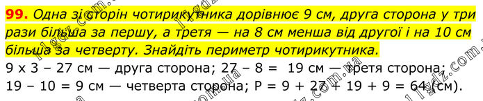 99. Одна зі сторін чотирикутника дорівнює 9 см, друга сторона у три рази більша за першу, а третя — на 8 см менша від другої і на 10 см більша за четверту. Знайдіть периметр чотирикутника. 9 • 3 – 27 см — друга сторона; 27 – 8 = 19 см — третя сторона; 19 – 10 = 9 см — четверта сторона; Р = 9 + 27 + 19 + 9 = 64 (см).