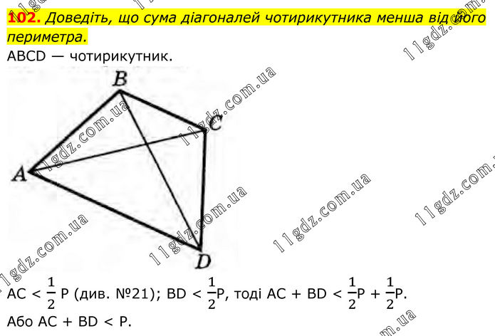 102. Доведіть, що сума діагоналей чотирикутника менша від його периметра. ABCD — чотирикутник. AC < 1/2 P (див. №21); BD < 1/2P, тоді AC + BD < 1/2P + 1/2P. Aбo AC + BD < P.