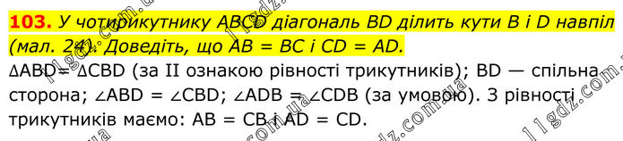 103. У чотирикутнику ABCD діагональ BD ділить кути В і D навпіл (мал. 24). Доведіть, що AB = BC і CD = AD. ∆ABD = ∆CBD (за II ознакою рівності трикутників); BD — спільна стopoнa; ∠ABD = ∠CBD; ∠ADB = ∠CDB (за умовою). З рівності трикутників маємо: AB = СВ і AD = CD.