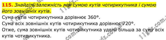 115. Знайдіть залежність між сумою кутів чотирикутника і сумою його зовнішніх кутів. Сума кутів чотирикутника дорівнює 360°. Сума всіх зовнішніх кутів чотирикутника дорівнює 720°. Отже, сума зовнішніх кутів чотирикутника удвічі більша за суму всіх кутів чотирикутника.