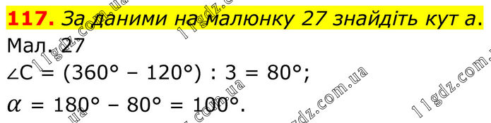 117. За даними на малюнку 27 знайдіть кут а. Мал. 27 ∠C = (360° – 120°) : 3 = 80°; α = 180° – 80° = 100°.