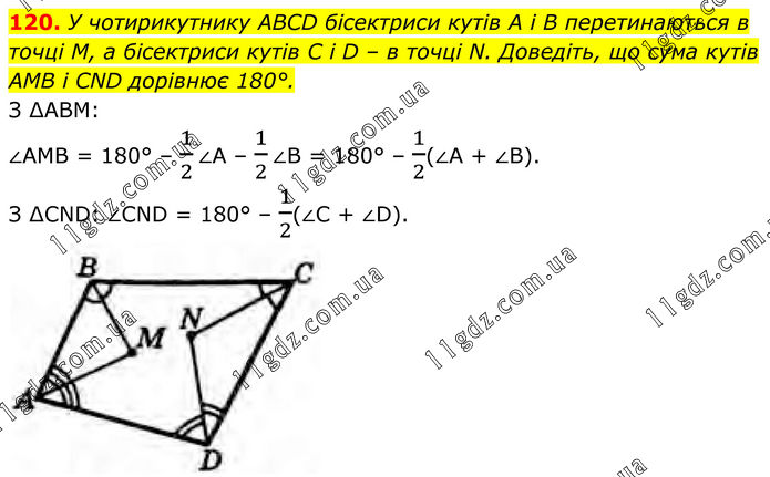 120. У чотирикутнику ABCD бісектриси кутів А і В перетинаються в точці М, а бісектриси кутів C і D – в точці N. Доведіть, що сума кутів AMB і CND дорівнює 180°. З ∆АВМ: ∠AMB = 180° – 1/2∠A – 1/2∠B = 180° – 1/2(∠A + ∠B). З ∆СND: ∠CND = 180° – 1/2(∠C + ∠D).