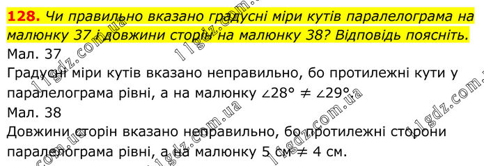 128. Чи правильно вказано градусні міри кутів паралелограма на малюнку 37 і довжини сторін на малюнку 38? Відповідь поясніть. Мал. 37 Градусні міри кутів вказано неправильно, бо протилежні кути у паралелограма рівні, а на малюнку ∠28° ≠ ∠29°. Мал. 38 Довжини сторін вказано неправильно, бо протилежні сторони паралелограма рівні, а на малюнку 5 см ≠ 4 см.