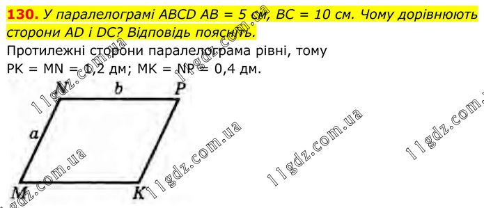 130. У паралелограмі ABCD AB = 5 см, BC = 10 см. Чому дорівнюють сторони AD і DC? Відповідь поясніть. Протилежні сторони паралелограма рівні, тому PK = MN = 1,2 дм; MK = NP = 0,4 дм.