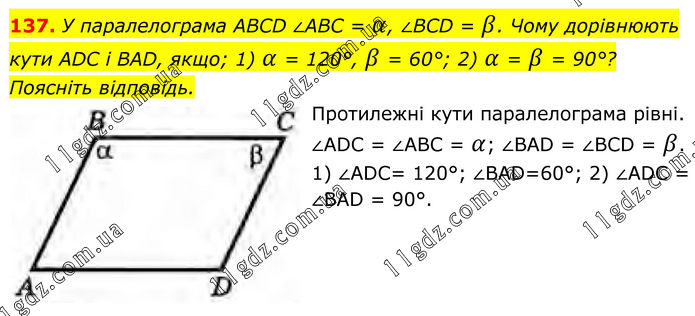 137. У паралелограма ABCD ∠ABC = α, ∠BCD = β. Чому дорівнюють кути ADC і BAD, якщо; 1) α = 120°, β = 60°; 2) α = β = 90°? Поясніть відповідь. Протилежні кути паралелограма рівні. ∠ADC = ∠ABC = α; ∠BAD = ∠BCD = β. 1) ∠ADC= 120°; ∠BAD=60°; 2) ∠ADC = ∠BAD = 90°.