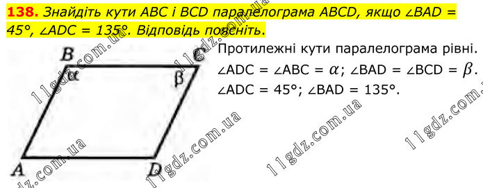 138. Знайдіть кути ABC і BCD паралелограма ABCD, якщо ∠BAD = 45°, ∠ADC = 135°. Відповідь поясніть. Протилежні кути паралелограма рівні. ∠ADC = ∠ABC = α; ∠BAD = ∠BCD = β. ∠ADC = 45°; ∠BAD = 135°.