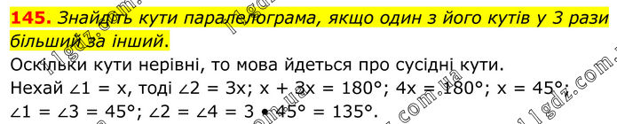 145. Знайдіть кути паралелограма, якщо один з його кутів у 3 рази більший за інший. Оскільки кути нерівні, то мова йдеться про сусідні кути. Нехай ∠1 = х, тоді ∠2 = Зх; х + Зх = 180°; 4х = 180°; х = 45°; ∠1 = ∠3 = 45°; ∠2 = ∠4 = 3 • 45° = 135°.