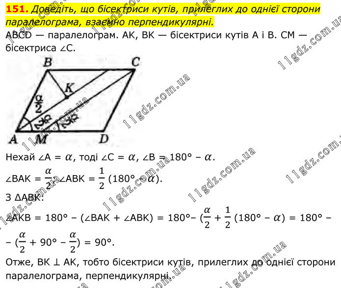 151. Доведіть, що бісектриси кутів, прилеглих до однієї сторони паралелограма, взаємно перпендикулярні. ABCD — паралелограм. АK, ВK — бісектриси кутів А і В. CM — бісектриса ∠C. Нехай ∠A = α, тоді ∠C = α, ∠B = 180° – α. ∠BAK = α/2; ∠ABK = 1/2 (180° – α). З ∆АВК: ∠AKB = 180° – (∠BAK + ∠ABK) = 180°– (α/2 + 1/2 (180° – α) = 180° – – (α/2 + 90° – α/2) = 90°. Отже, ВК ⊥ АK, тобто бісектриси кутів, прилеглих до однієї сторони паралелограма, перпендикулярні.