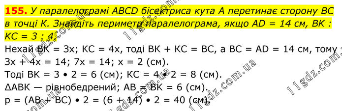 155. У паралелограмі ABCD бісектриса кута А перетинає сторону BC в точці К. Знайдіть периметр паралелограма, якщо AD = 14 см, BK : KC = 3 : 4. Нехай ВК = Зх; КС = 4х, тоді ВК + КС = ВС, а ВС = AD = 14 см, тому Зх + 4х = 14; 7х = 14; х = 2 (см). Тоді BK = 3 • 2 = 6 (см); КС = 4 • 2 = 8 (см). ∆АВК — рівнобедрений; AB = BK = 6 (см). р = (AB + ВС) • 2 = (6 + 14) • 2 = 40 (см).
