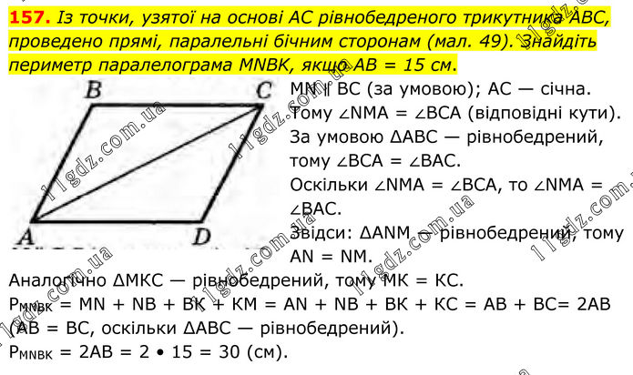 Із точки, узятої на основі AC рівнобедреного трикутника ABC, проведено прямі, паралельні бічним сторонам (мал. 49). Знайдіть периметр паралелограма MNBK, якщо AB = 15 см. MN ∥ ВС (за умовою); АС — січна. Тому ∠NMA = ∠BCA (відповідні кути). За умовою ∆АВС — рівнобедрений, тому ∠BCA = ∠BAC. Оскільки ∠NMA = ∠BCA, то ∠NMA = ∠BAC. Звідси: ∆ANM — рівнобедрений, тому AN = NM. Аналогічно ∆MКС — рівнобедрений, тому МК = КС. PMNBK = MN + NB + ВК + КМ = AN + NB + ВК + КС = АВ + ВС= 2АВ (AB = ВС, оскільки ∆АВС — рівнобедрений). PMNBK = 2АВ = 2 • 15 = 30 (см).