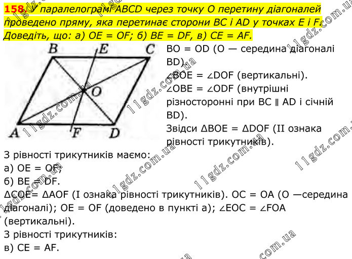 У паралелограмі ABCD через точку O перетину діагоналей проведено пряму, яка перетинає сторони BC і AD у точках E і F. Доведіть, що: a) OE = OF; б) BE = DF, в) СЕ = AF. BO = OD (О — середина діагоналі BD). ∠ВОЕ = ∠DOF (вертикальні). ∠OBE = ∠ODF (внутрішні різносторонні при ВС ∥ AD і січній BD). Звідси ∆ВОЕ = ∆DOF (II ознака рівності трикутників). З рівності трикутників маємо: а) OE = OF; б) BE = DF. ∆СОЕ= ∆AOF (І ознака рівності трикутників). ОС = ОА (О —середина діагоналі); ОЕ = OF (доведено в пункті а); ∠EOC = ∠FOA (вертикальні). З рівності трикутників: в) СЕ = АF.