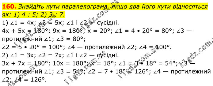 160. Знайдіть кути паралелограма, якщо два його кути відносяться як: 1) 4 : 5; 2) 3 : 7. 1) ∠1 = 4x; ∠2 = 5х; ∠1 і ∠2 — сусідні. 4х + 5х = 180°; 9х = 180°; х = 20°; ∠1 = 4 • 20° = 80°; ∠3 — протилежний ∠1; ∠3 = 80°; ∠2 = 5 • 20° = 100°; ∠4 — протилежний ∠2; ∠4 = 100°. 2) ∠1 = Зx; ∠2 = 7х; ∠1 і ∠2 — сусідні. Зх + 7x = 180°; 10х = 180°; х = 18°; ∠1 = З • 18° = 54°; ∠3 — протилежний ∠1; ∠3 = 54°; ∠2 = 7 • 18° = 126°; ∠4 — протилежний ∠2; ∠4 = 126°.