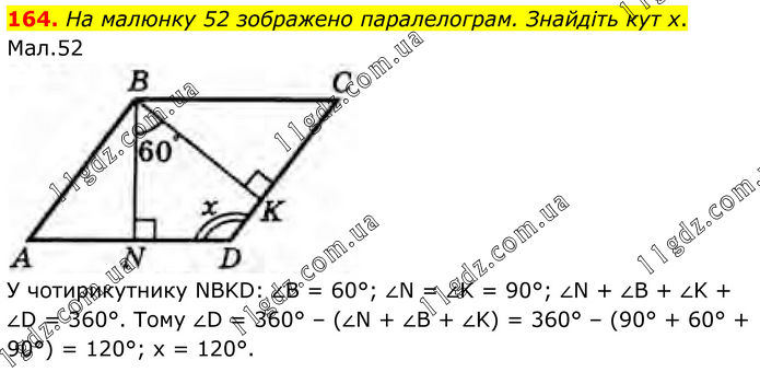 На малюнку 52 зображено паралелограм. Знайдіть кут х. Мал.52 У чотирикутнику NBKD: ∠B = 60°; ∠N = ∠K = 90°; ∠N + ∠B + ∠K + ∠D = 360°. Тому ∠D = 360° – (∠N + ∠B + ∠K) = 360° – (90° + 60° + 90°) = 120°; x = 120°.
