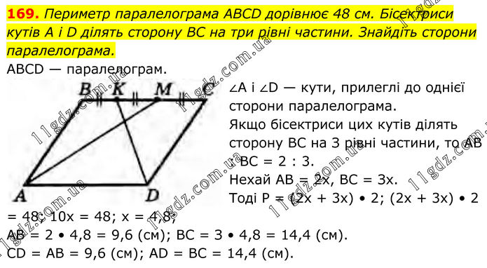 Периметр паралелограма ABCD дорівнює 48 см. Бісектриси кутів А і D ділять сторону BC на три рівні частини. Знайдіть сторони паралелограма. ABCD — паралелограм. ∠A і ∠D — кути, прилеглі до однієї сторони паралелограма. Якщо бісектриси цих кутів ділять сторону ВС на З рівні частини, то AB : ВС = 2 : 3. Нехай АВ = 2x, ВС = Зx. Тоді Р = (2х + 3х) • 2; (2х + 3х) • 2 = 48; 10х = 48; x = 4,8; AB = 2 • 4,8 = 9,6 (см); ВС = З • 4,8 = 14,4 (см). CD = AB = 9,6 (см); AD = ВС = 14,4 (см).