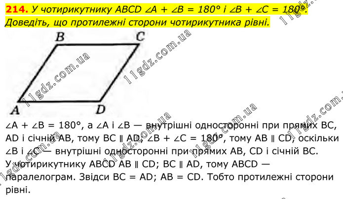У чотирикутнику ABCD ∠A + ∠B = 180° і ∠B + ∠C = 180°. Доведіть, що протилежні сторони чотирикутника рівні. ∠A + ∠B = 180°, а ∠A і ∠B — внутрішні односторонні при прямих ВС, AD і січній АВ, тому ВС ∥ AD; ∠B + ∠C = 180°, тому АВ ∥ CD, оскільки ∠B і ∠C — внутрішні односторонні при прямих АВ, CD і січній ВС. У чотирикутнику ABCD АВ ∥ CD; ВС ∥ AD, тому ABCD — паралелограм. Звідси ВС = AD; АВ = CD. Тобто протилежні сторони рівні.