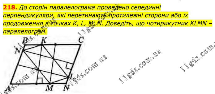До сторін паралелограма проведено серединні перпендикуляри, які перетинають протилежні сторони або їх продовження в точках К, L, М, N. Доведіть, що чотирикутник KLMN – паралелограм.