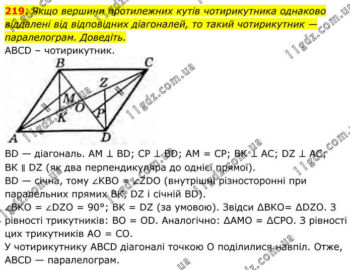 Якщо вершини протилежних кутів чотирикутника однаково віддалені від відповідних діагоналей, то такий чотирикутник — паралелограм. Доведіть. ABCD – чотирикутник. BD — діагональ. AM ⊥ BD; СР ⊥ BD; АМ = СР; ВК ⊥ AC; DZ ⊥ АС; ВК ∥ DZ (як два перпендикуляра до однієї прямої). BD — січна, тому ∠KBO = ∠ZDO (внутрішні різносторонні при паралельних прямих ВК, DZ і січній BD). ∠BKO = ∠DZO = 90°; BK = DZ (за умовою). Звідси ∆ВКО= ∆DZO. З рівності трикутників: BO = OD. Аналогічно: ∆АМО = ∆СРО. З рівності цих трикутників АО = CO. У чотирикутнику ABCD діагоналі точкою О поділилися навпіл. Отже, ABCD — паралелограм.