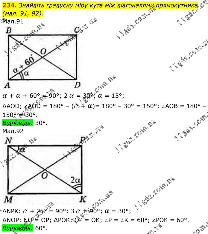 Знайдіть градусну міру кута між діагоналями прямокутника (мал. 91, 92). Мал.91 α + α + 60° = 90°; 2 α = 30°; α = 15°; ∆AOD: ∠AOD = 180° – (α + α)= 180° – 30° = 150°; ∠AOB = 180° – 150° = 30°. Відповідь: 30°. Мал.92 ∆NPK: α + 2 α = 90°; 3 α = 90°; α = 30°; ∆NOP: NO = OP; ∆РОК: OP = OK; ∠P = ∠K = 60°; ∠POK = 60°. Відповідь: 60°.