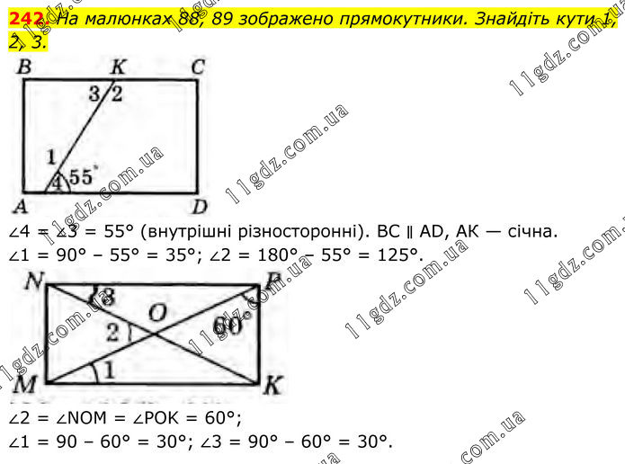 На малюнках 88, 89 зображено прямокутники. Знайдіть кути 1, 2, 3. ∠4 = ∠3 = 55° (внутрішні різносторонні). ВС ∥ AD, АК — січна. ∠1 = 90° – 55° = 35°; ∠2 = 180° – 55° = 125°. ∠2 = ∠NOM = ∠POK = 60°; ∠1 = 90 – 60° = 30°; ∠3 = 90° – 60° = 30°.