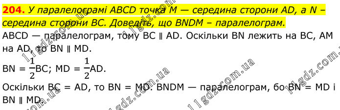 204. У паралелограмі ABCD точка M — середина сторони AD, a N – середина сторони BC. Доведіть, що BNDM – паралелограм. ABCD — паралелограм, тому ВС ∥ AD. Оскільки BN лежить на ВС, AM на AD, то BN ∥ MD. BN = 1/2BC; MD = 1/2AD. Оскільки ВС = AD, то BN = MD. BNDM — паралелограм, бо BN = MD і BN ∥ MD.