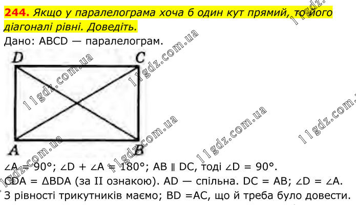 Якщо у паралелограма хоча б один кут прямий, то його діагоналі рівні. Доведіть. Дано: ABCD — паралелограм. ∠A = 90°; ∠D + ∠A = 180°; AB ∥ DC, тоді ∠D = 90°. CDA = ∆BDA (за II ознакою). AD — спільна. DC = АВ; ∠D = ∠A. З рівності трикутників маємо; BD = АС, що й треба було довести.