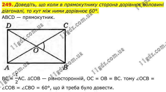 Доведіть, що коли в прямокутнику сторона дорівнює половині діагоналі, то кут між ними дорівнює 60°. ABCD — прямокутник. ВС = 1/2АС. ∆СОВ — рівносторонній, ОС = ОВ = ВС. тому ∠ОСВ = ∠COB = ∠СВО = 60°, що й треба було довести.