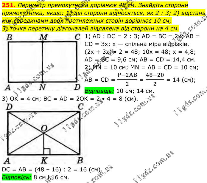 Периметр прямокутника дорівнює 48 см. Знайдіть сторони прямокутника, якщо: 1) дві сторони відносяться, як 2 : 3; 2) відстань між серединами двох протилежних сторін дорівнює 10 см; 3) точка перетину діагоналей віддалена від сторони на 4 см. 1) AD : DC = 2 : 3; AD = ВС = 2х; AB = CD = Зх; x — спільна міра відрізків. (2х + 3х) • 2 = 48; 10х = 48; x = 4,8; AD = ВС = 9,6 см; АВ = CD = 14,4 см. 2) MN = 10 см; MN = АВ = CD = 10 см; AB = CD = (P-2AB)/2 = (48-20)/2 = 14 (см); Відповідь: 10 см; 14 см. 3) ОК = 4 см; ВС = AD = 2ОК = 2 • 4 = 8 (см). DC = АВ = (48 – 16) : 2 = 16 (см). Відповідь: 8 см і 16 см.