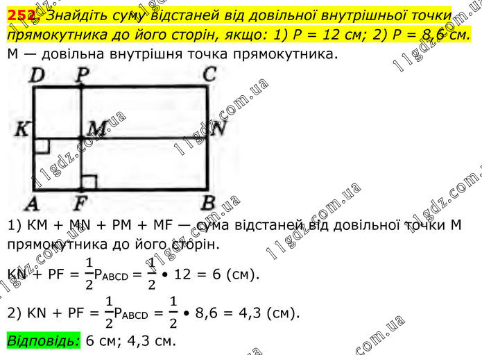 Знайдіть суму відстаней від довільної внутрішньої точки прямокутника до його сторін, якщо: 1) P = 12 см; 2) P = 8,6 см. М — довільна внутрішня точка прямокутника. 1) КМ + MN + РМ + MF — сума відстаней від довільної точки М прямокутника до його сторін. KN + PF = 1/2PABCD = 1/2 • 12 = 6 (см). 2) KN + PF = 1/2PABCD = 1/2 • 8,6 = 4,3 (см). Відповідь: 6 см; 4,3 см.