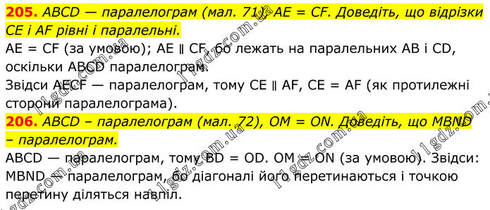 205. ABCD — паралелограм (мал. 71), AE = CF. Доведіть, що відрізки CE і AF рівні і паралельні. АE = CF (за умовою); AE ∥ CF, бо лежать на паралельних АВ і CD, оскільки ABCD паралелограм. Звідси АEСF — паралелограм, тому СE ∥ AF, СЕ = AF (як протилежні сторони паралелограма). 206. ABCD – паралелограм (мал. 72), OM = ON. Доведіть, що MBND – паралелограм. ABCD — паралелограм, тому BD = OD. ОМ = ON (за умовою). Звідси: MBND — паралелограм, бо діагоналі його перетинаються і точкою перетину діляться навпіл.