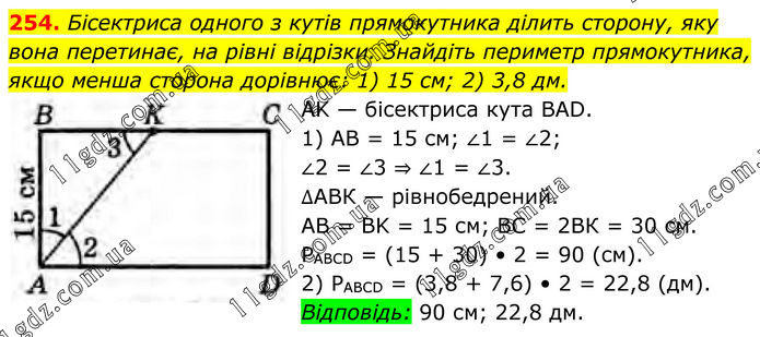 Бісектриса одного з кутів прямокутника ділить сторону, яку вона перетинає, на рівні відрізки. Знайдіть периметр прямокутника, якщо менша сторона дорівнює: 1) 15 см; 2) 3,8 дм. AK — бісектриса кута BAD. 1) AB = 15 cм; ∠1 = ∠2; ∠2 = ∠3 ⇒ ∠1 = ∠3. ∆АВК — рівнобедрений. AB = BK = 15 см; ВС = 2ВК = 30 см. РABCD = (15 + 30) • 2 = 90 (cм). 2) PABCD = (3,8 + 7,6) • 2 = 22,8 (дм). Відповідь: 90 см; 22,8 дм.