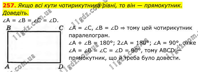 Якщо всі кути чотирикутника рівні, то він — прямокутник. Доведіть. ∠A = ∠B = ∠C = ∠D. ∠A = ∠C, ∠B = ∠D ⇒ тому цей чотирикутник паралелограм. ∠A + ∠B = 180°; 2∠A = 180°; ∠A = 90°, отже ∠A = ∠B = ∠C = ∠D = 90°, тому ABCD — прямокутник, що й треба було довести.