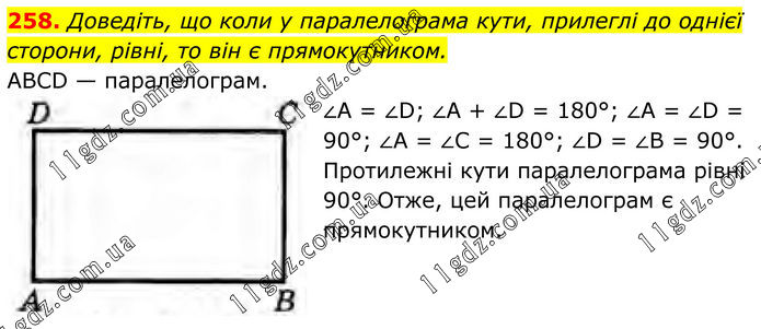 Доведіть, що коли у паралелограма кути, прилеглі до однієї сторони, рівні, то він є прямокутником. ABCD — паралелограм. ∠A = ∠D; ∠A + ∠D = 180°; ∠A = ∠D = 90°; ∠A = ∠C = 180°; ∠D = ∠B = 90°. Протилежні кути паралелограма рівні 90°. Отже, цей паралелограм є прямокутником.