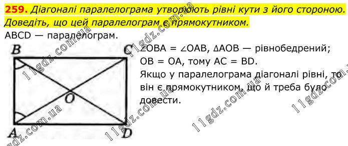 Діагоналі паралелограма утворюють рівні кути з його стороною. Доведіть, що цей паралелограм є прямокутником. ABCD — паралелограм. ∠OBA = ∠OAB, ∆АОВ — рівнобедрений; ОВ = ОА, тому АС = BD. Якщо у паралелограма діагоналі рівні, то він є прямокутником, що й треба було довести.