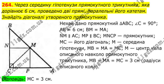 Через середину гіпотенузи прямокутного трикутника, яка дорівнює 6 см, проведено дві прямі, паралельні його катетам. Знайдіть діагоналі утвореного прямокутника. Нехай дано прямокутний ∆АВС; ∠C = 90°; AB = 6 см; ВМ = МА; NM ∥ АС; МР ∥ ВС; MNCP — прямокутник; MC — його діагональ; М — середина гіпотенузи, MB = МА = MC; М — центр кола описаного навколо прямокутного трикутника, MB = МА = MC = З см (радіуси описаного кола). Відповідь: MC = 3 см.