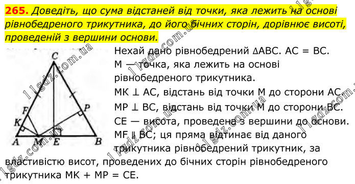 Доведіть, що сума відстаней від точки, яка лежить на основі рівнобедреного трикутника, до його бічних сторін, дорівнює висоті, проведеній з вершини основи. Нехай дано рівнобедрений ∆ABC. AC = ВС. М — точка, яка лежить на основі рівнобедреного трикутника. МК ⊥ AC, відстань від точки М до сторони АС. МР ⊥ ВС, відстань від точки М до сторони ВС. СЕ — висота, проведена з вершини до основи. MF ∥ ВС; ця пряма відтинає від даного трикутника рівнобедрений трикутник, за властивістю висот, проведених до бічних сторін рівнобедреного трикутника MK + МР = СE.